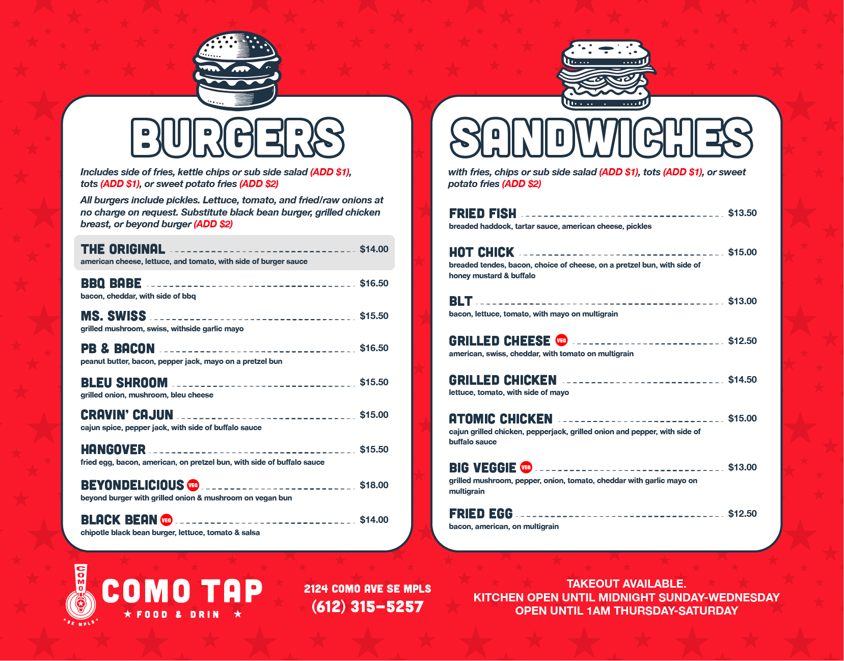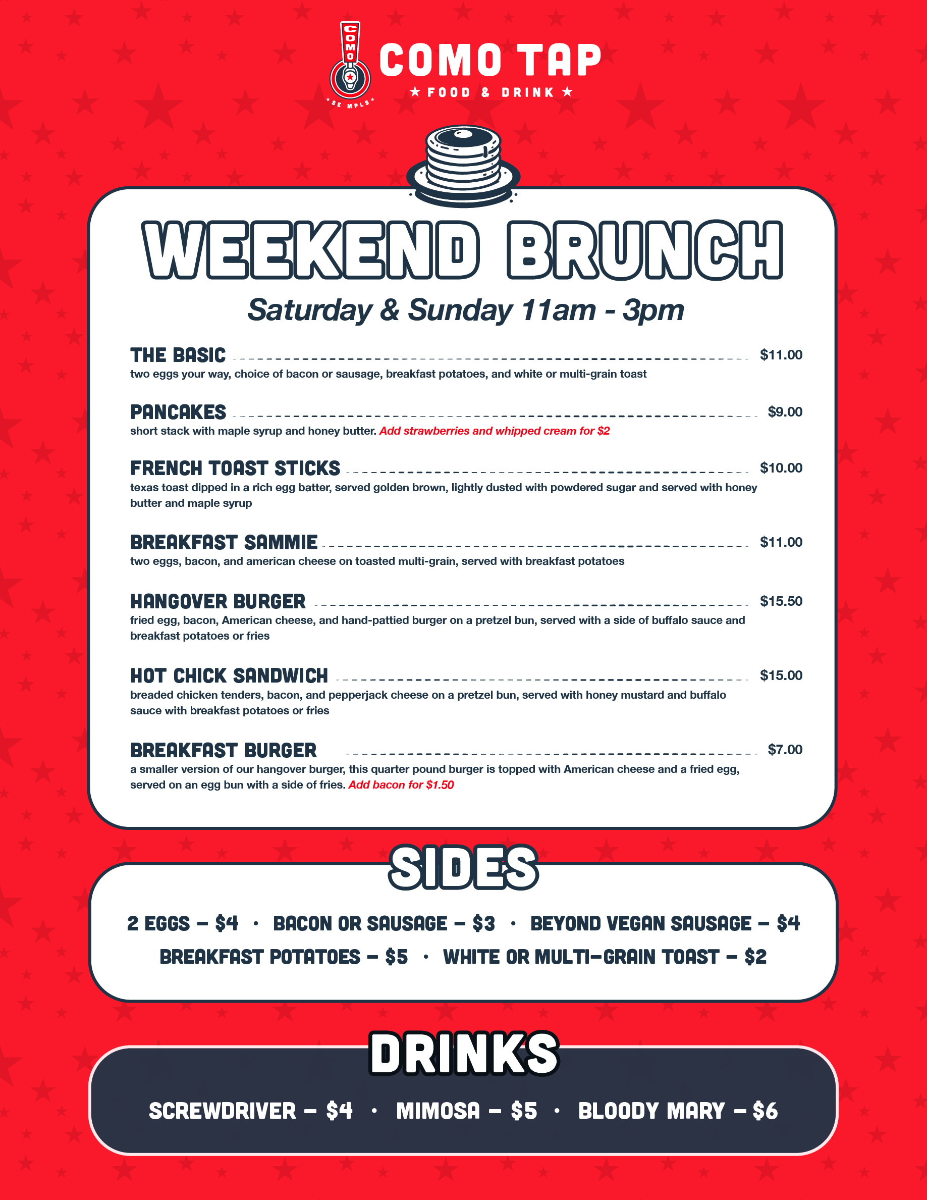 Experience the perfect weekend retreat at Como Tap's brunch, held every Saturday and Sunday from 11 AM to 3 PM. This delightful brunch offers a simple menu with drink specials on screwdrivers, Bloody Mary’s and mimosas. Como Tap's weekend brunch is the perfect way to savor the weekend and create lasting memories.